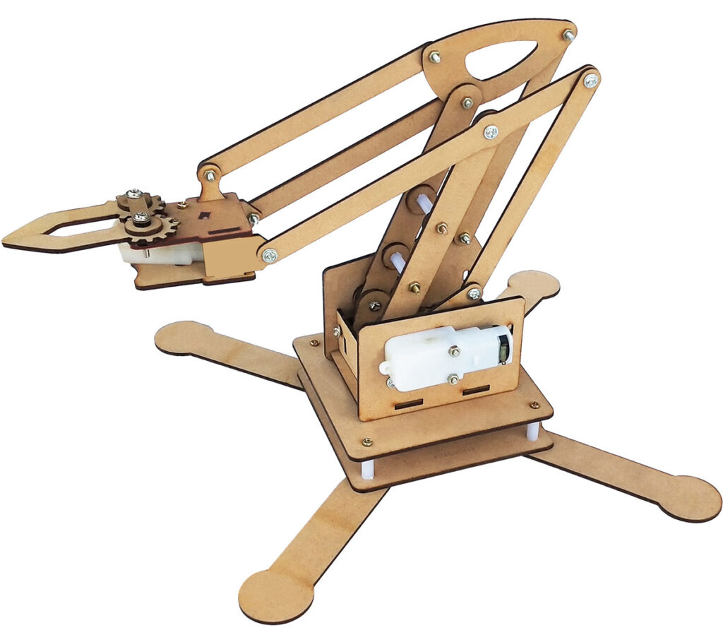The Kit4Curious 4 DOF (Degree of freedom) Robotic Arm provides an engaging and practical solution for robotics enthusiasts and learners, allowing them to explore the mechanics of robotics in real-time. Designed from durable MDF wooden fiberboard, this robotic arm is semi-assembled, featuring four pre-fitted DC motors for smooth and precise movements. The four Degrees of Freedom (DOF) enable complex motions, such as gripping and lifting, making this robotic arm suitable for a range of projects and applications.